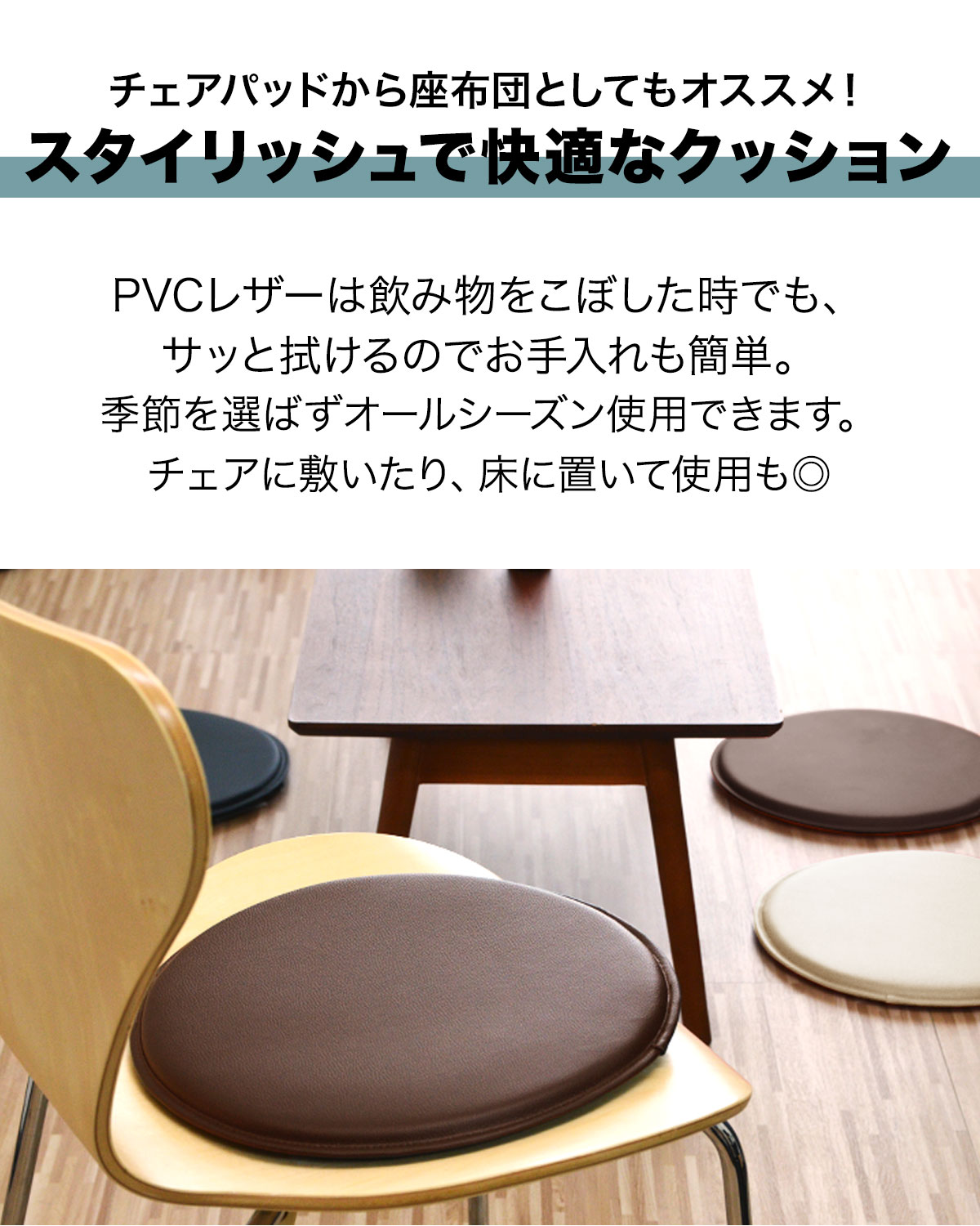 カラー: ・ブラック・ベージュ ・ブラウン ・レッド ・オレンジ サイズ: (約)φ35cm×2cm 材質: カバー:PVCレザー 中材:ウレタンフォーム 重量: (約)170g 特記事項: ※汚れた場合は乾いた布または湿らせた布で軽くふくとってください。